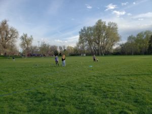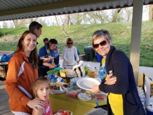 Vi hade helt underbart väder i DeKoevend parken och ungefär 50 personer kom. Stora som små, spelade kubb, kastade boll, lekte på lekplatsen och grillade medhavd mat samt delade med sej av sallader och efterrätter och de vuxna smuttade på en och annan öl eller ett glas vin. När det började mörkna startade vi eldkorgar och barnen gjorde s’mores vid elden. Kören sjöng flera härliga vårsånger och avslutade med Studentsången då studentmössorna naturligtvis höjdes i luften.